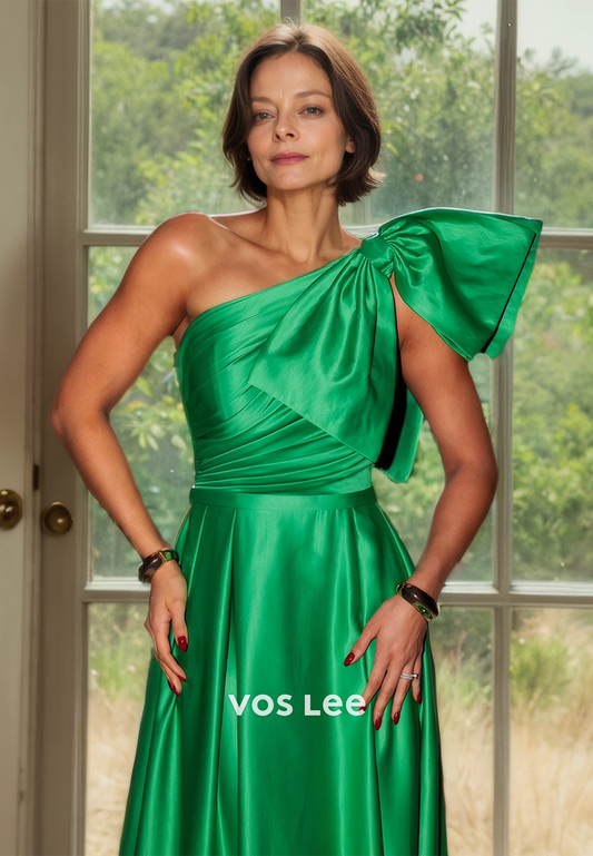 Elegant A-Line Green Satin Bow One Shoulder Pleated Mother of the Bride Dress Floor Length