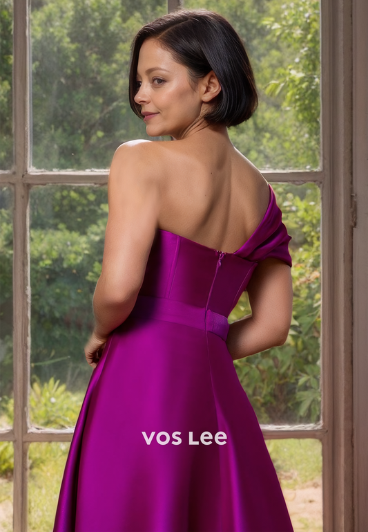 A-Line Satin One Shoulder Mother of the Bride Dress Draped Floor Length Zipper Back Elegant Long Party Dress