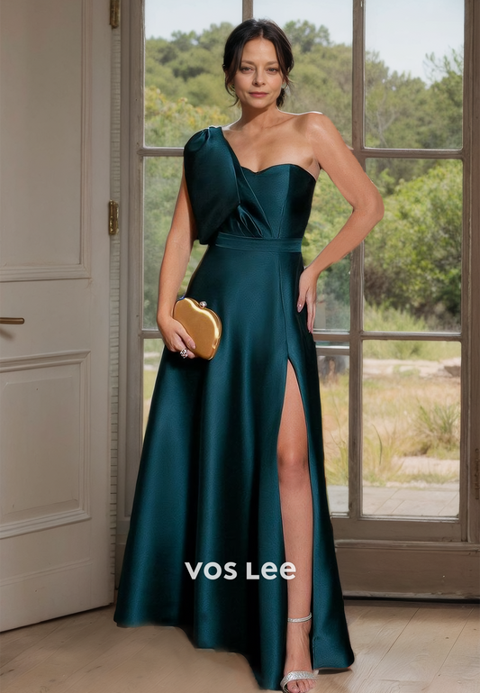 A-Line Satin Luxury Bow One Shoulder Floor Length Mother of the Bride Dresses with High Split