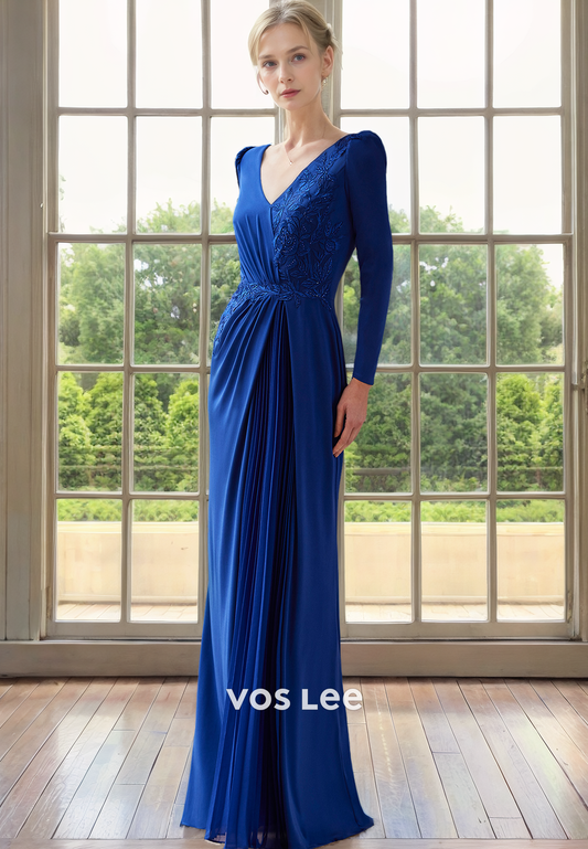 Sheath/Column Pleated V Neck Long Sleeves Formal Mother of the Bride Dress with Appliques