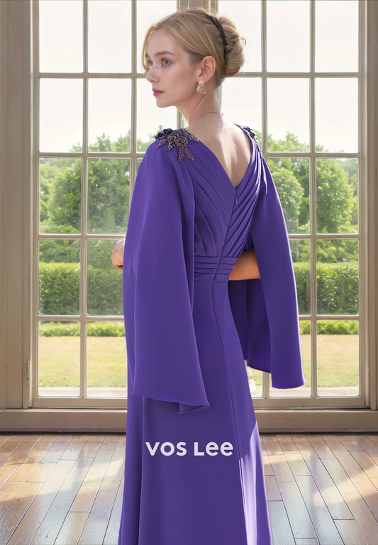 Classy Purple V Neck Long Sleeves Floor Length Pleated Mother of the Bride Dress