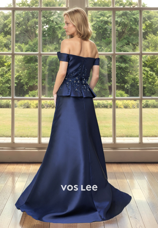 Graceful A-Line Satin Off-Shoulder Floor Length Side Slit Mother of the Bride Dress Zipper Back