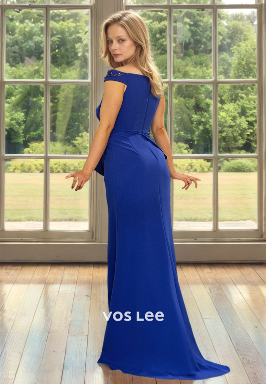 Graceful Satin Royal Blue Off-Shoulder Appliqued Pleated Mermaid Mother of the Bride Dress