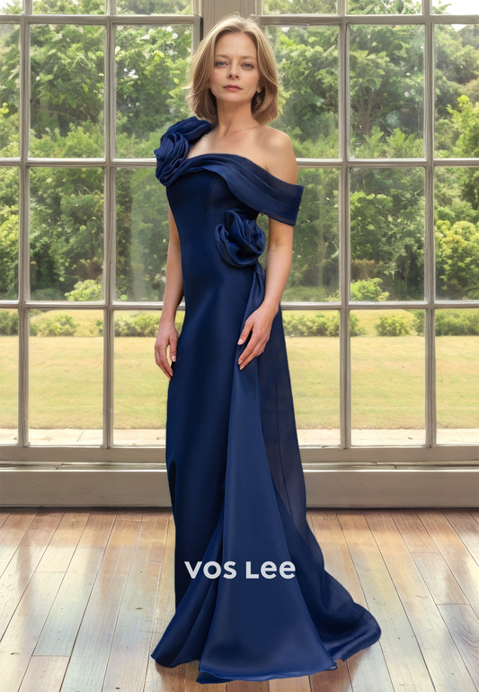 A-Line Floor Length Satin Mother of the Bride Dress Off-Shoulder Elegant Formal Cocktail Dress