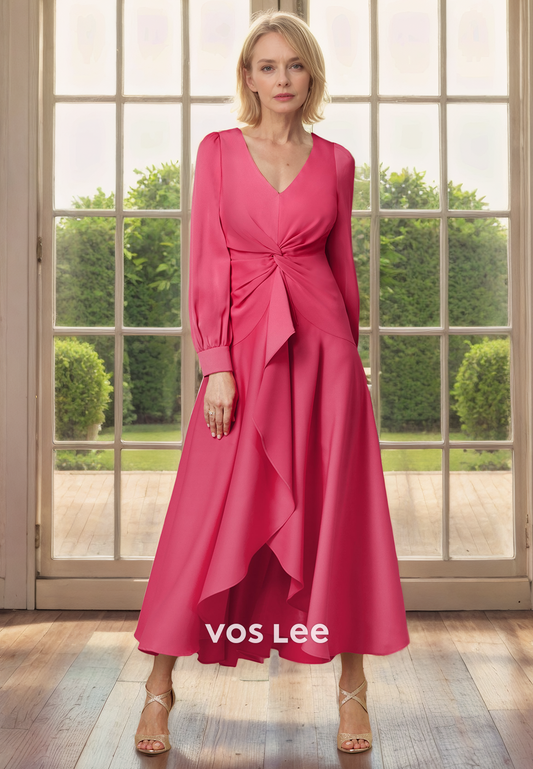 A-Line V-Neck Tea-Length Long Sleeves Ruched Chiffon Mother of the Bride Dress/Cocktail Dress