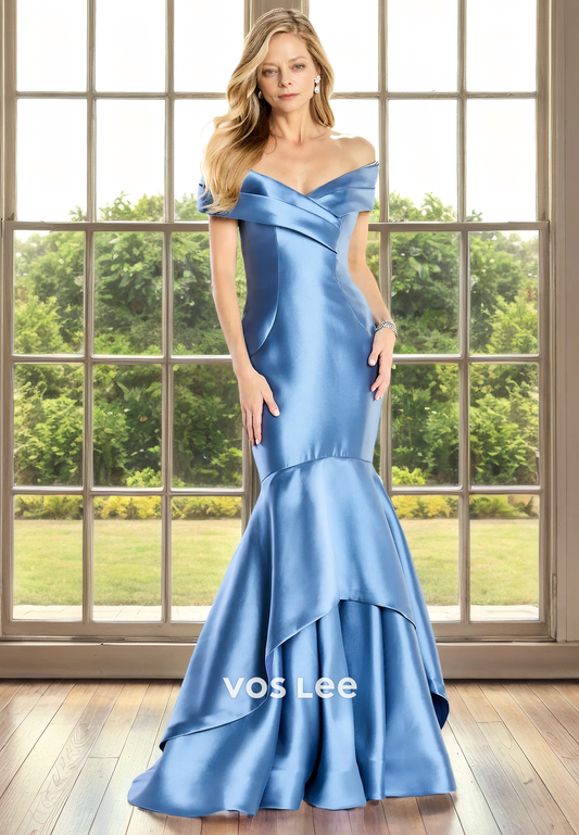 Trumpet/Mermaid V-Neck Off Shoulder Sweep Train Satin Mother of the Bride Dress/Cocktail Dress