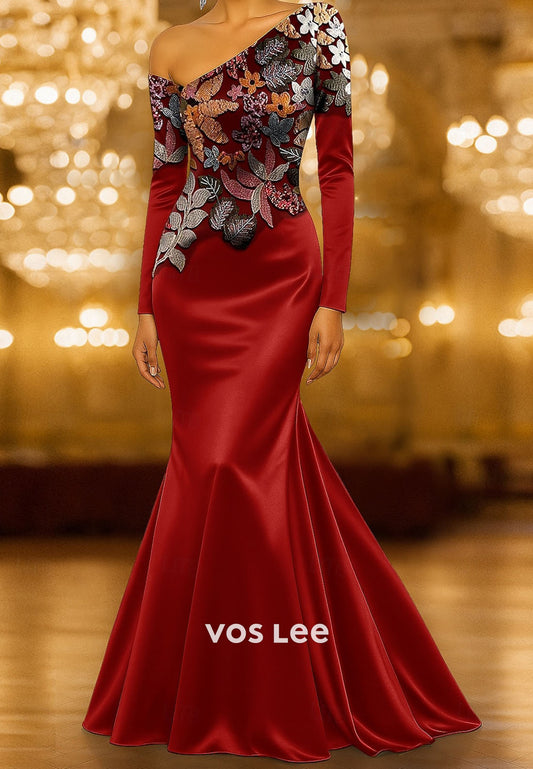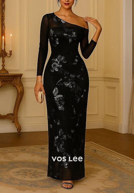 One-Shoulder Sheer Long Sleeves Sheath Flower Embroidery Evening Dress