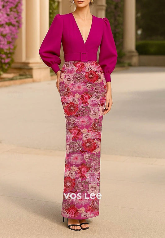 3/4 Sleeve V Neck Pleated Floral Embossed Floor-Length Sheath Mother of Bride Dresses