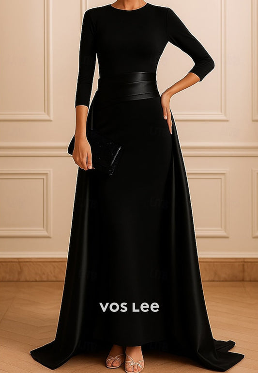 3/4 Sleeve Scoop Pleated Long Mermaid Mother of Bride Dresses with Sweep Train