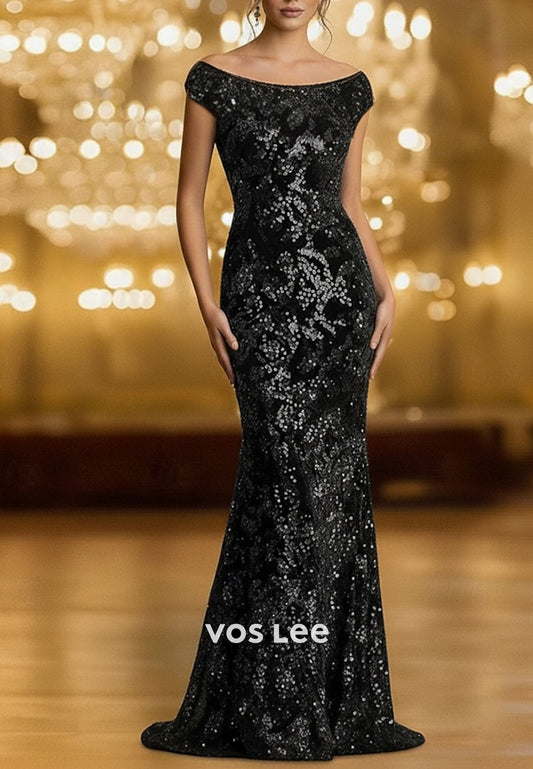 Elegant Glittering Off Shoulder Sheath Floor Length Evening Gown Wedding Guest Dress