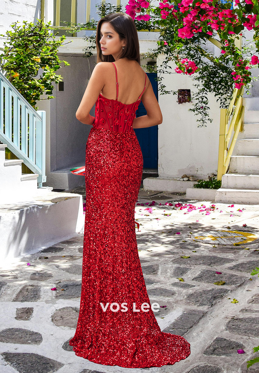 Sparkly V Neck Spaghetti Straps Sheath Sequined Draped Sweep Train Prom Party Dress
