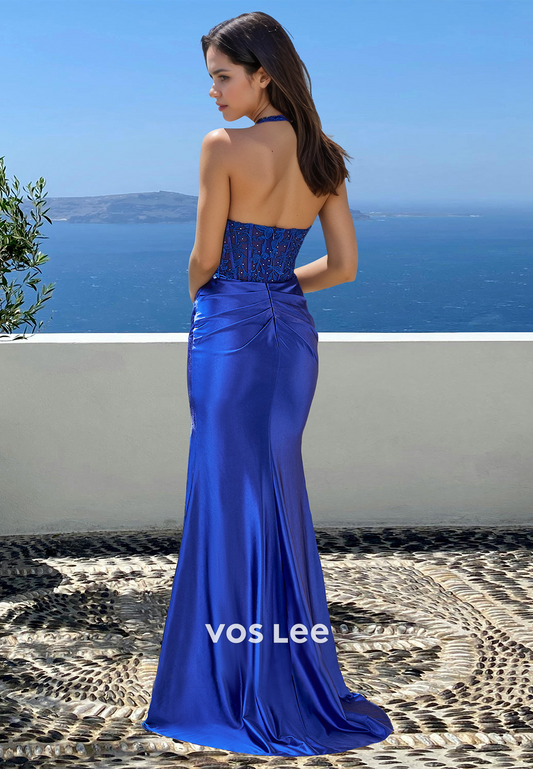 Sexy Sheath Halter Backless Lace Appliques Glitter Side Split Prom Evening Dress