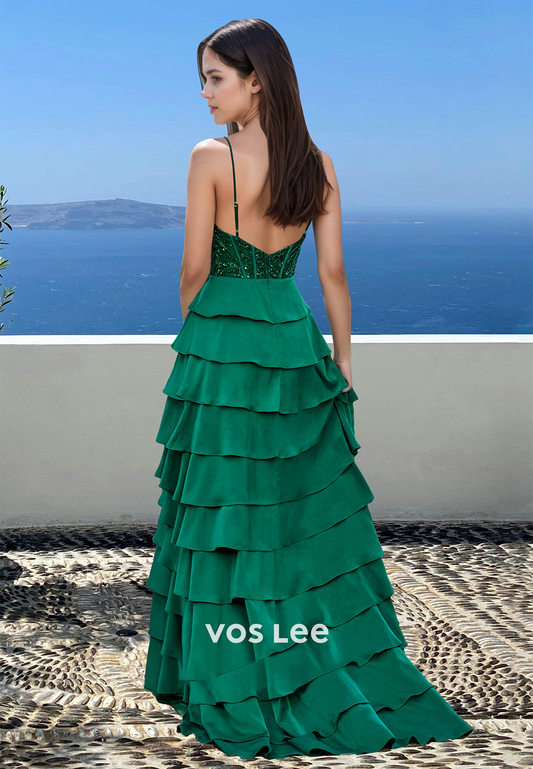 Unique A-Line Tiered Satin Lace Appliques Side Split Dark Green Prom Formal Dress