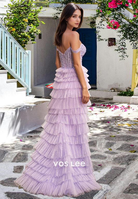 Gorgeous Column Off Shoulder Tiered Tulle Sequins Lace Appliques Prom Birthday Dress
