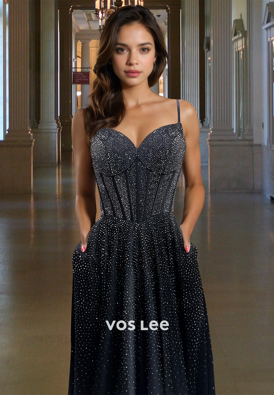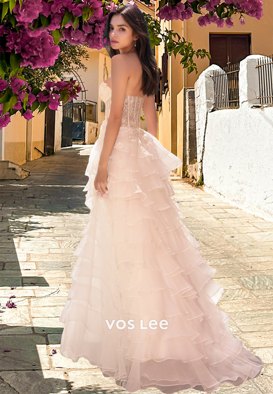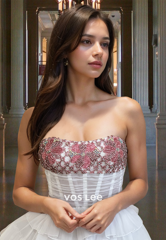 Modest A-Line Strapless Beaded High Split Tiered Tulle Glitter Prom Formal Dress