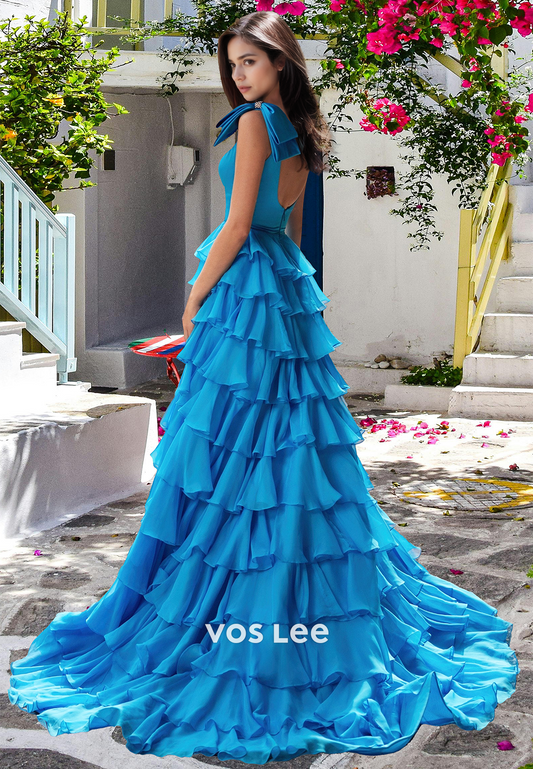 Sexy Low V Neck A-Line Tiered Satin Sweep Train Backless Prom Party Dress