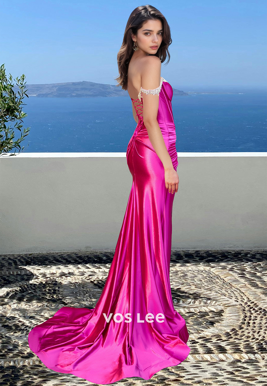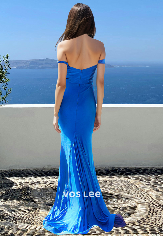 Elegant Column Off Shoulder Side Split Sequins Lace Sweep Train Prom Formal Dress