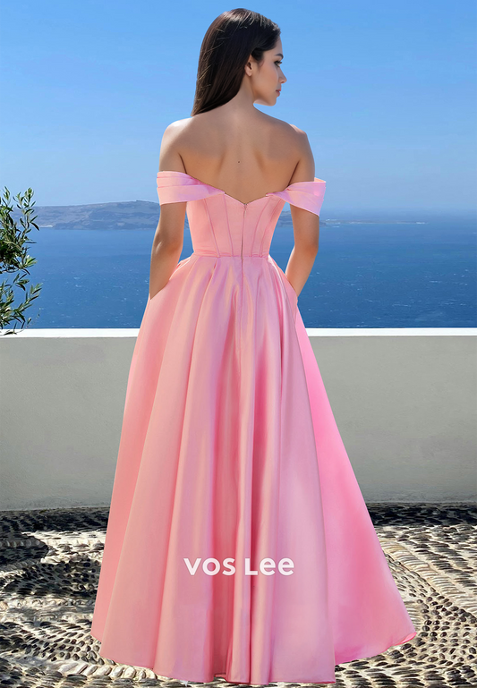 Simple Off Shoulder A-Line Back Zipper Pleated Sweep Train Satin Prom Graduation Dress
