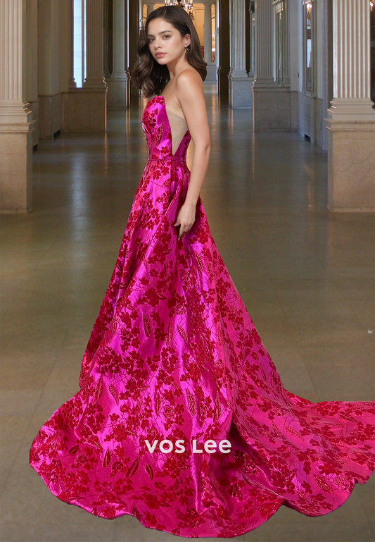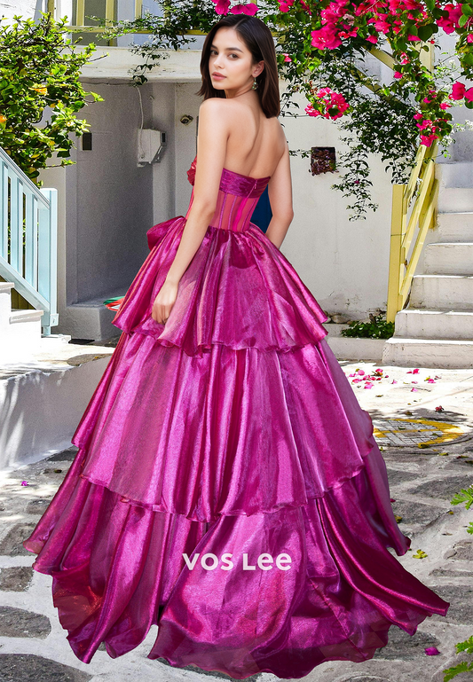 Unqiue A-Line Strapless Illusion Tiered Sparkly Fuchsia Satin Prom Evening Dress