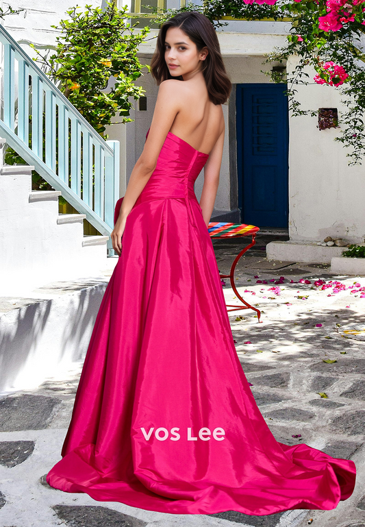 Modest A-Line Strapless Bow Side Split Sleeveless Pleated Satin Prom Evening Dress