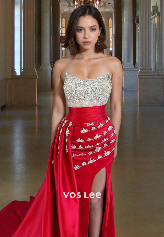 Charming Red Strapless Sheath High Split Beaded Ruched Prom Pageant Dress