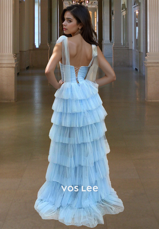 Ornate Square Neck Sky Blue Bow A-Line Tiered Tulle Lace Up Prom Pageant Dress