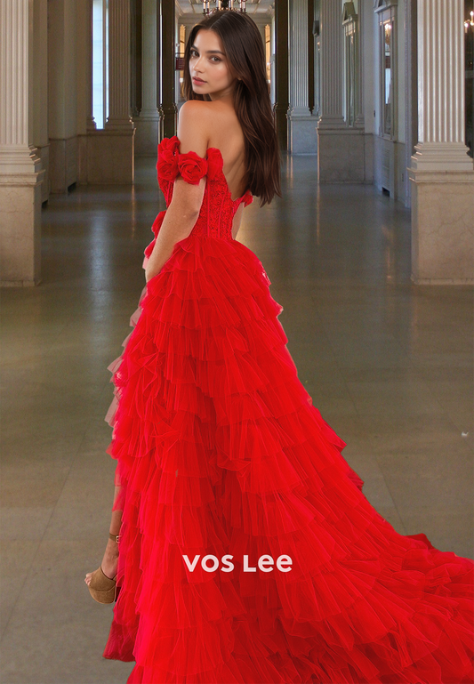Charming A-Line Off Shoulder Back Zipper Lace Tiered Tulle Prom Evening Dress