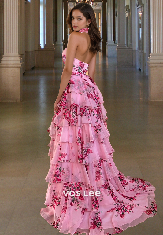Ornate A-Line Halter Tiered Satin Bow Side Split Sleeveless Prom Formal Dress