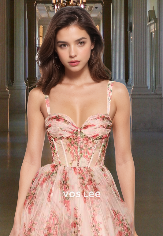 Floral Print A-Line Princess Tulle Prom Ball Gown Quinceanera Casual Party Dress