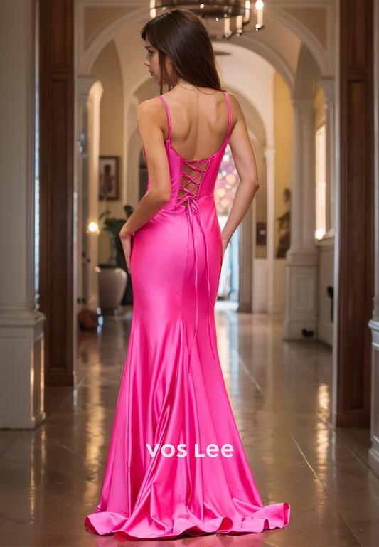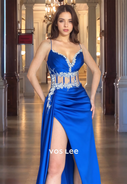 Elegant Spaghetti Straps Deep V Neck Lace Appliques Side Split Prom Formal Dress