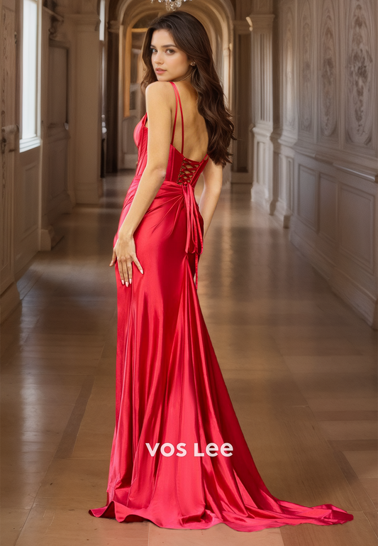 Elegant Sweetheart Column Spaghetti Straps Draped Prom Evening Dress with Split