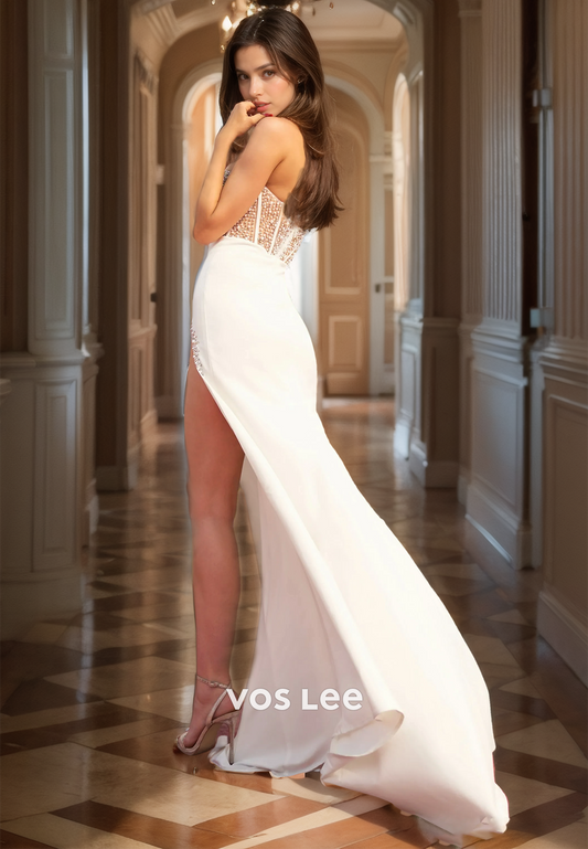 Graceful Column Sweetheart Beaded High Split Prom Evening Dress Glitter