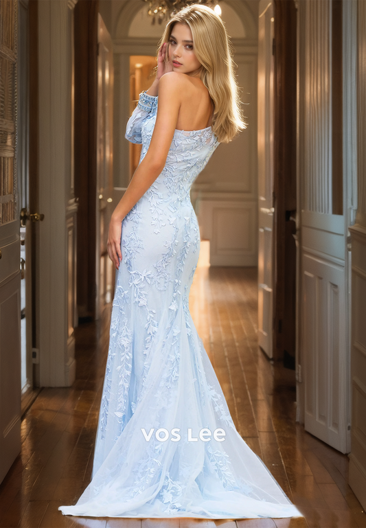 Sexy Lace Appliques Off-Shoulder High Split Prom Formal Dress Glitter
