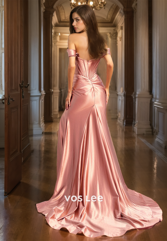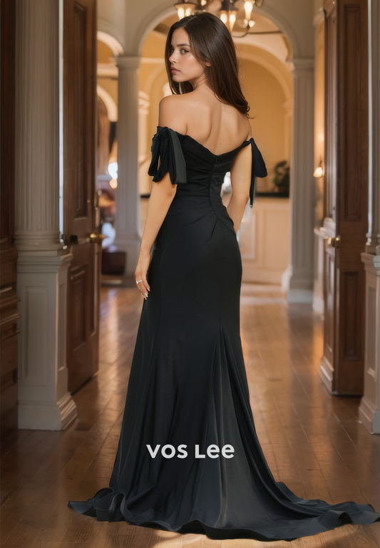Simple Column Off Shoulder Ruched Side Split Prom Party Dress