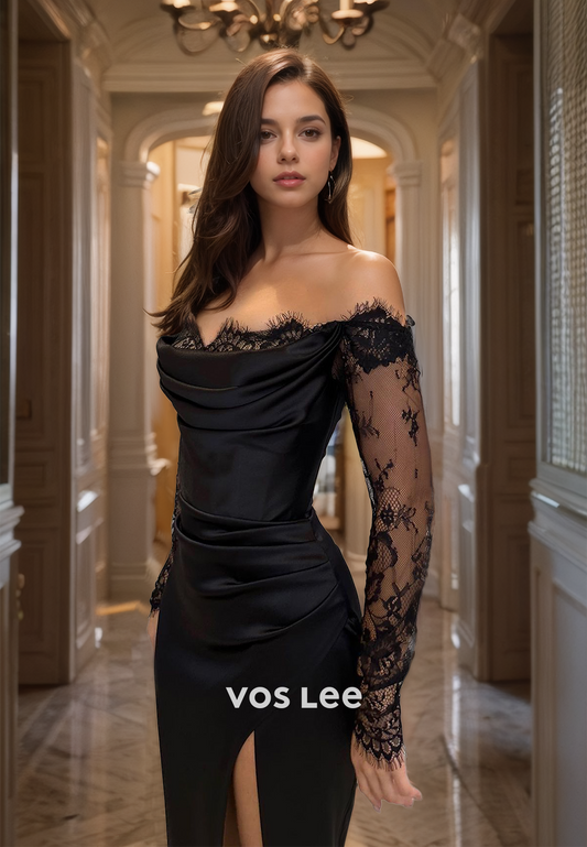 Elegant Black Satin Black Prom Dress Lace Long Sleeves Floor Length Evening Party Gown with High Slit