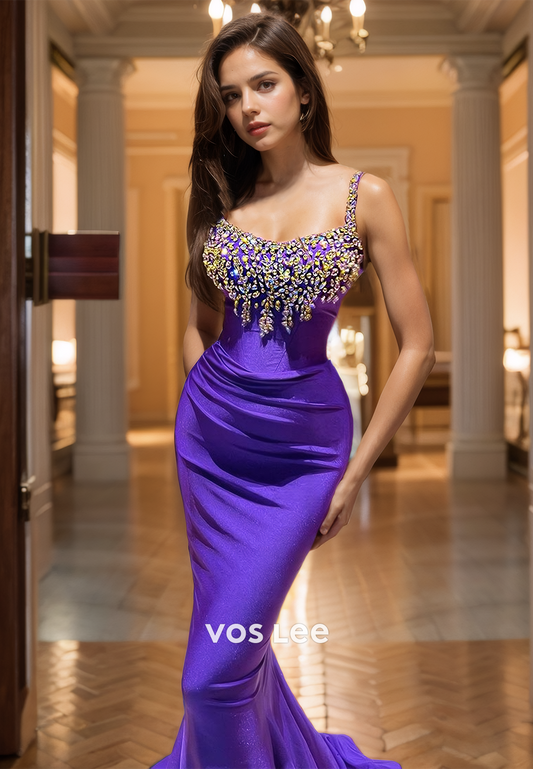 Graceful Scoop Mermaid Purple Beads Quinceanera Dress Spaghetti Straps Satin Prom Dress