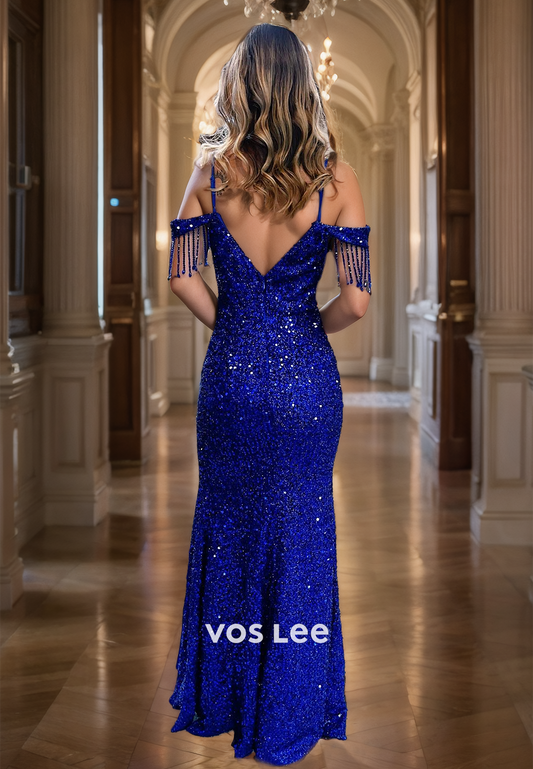 Sparkly Royal Blue V Neck Prom Dress Off-Shoulder Tassel Side Split Mermaid Party Gown