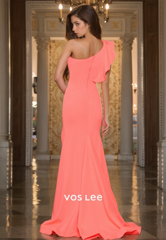 Elegant One Shoulder Column Ruffles Satin Sleeveless High Split Prom Party Dress