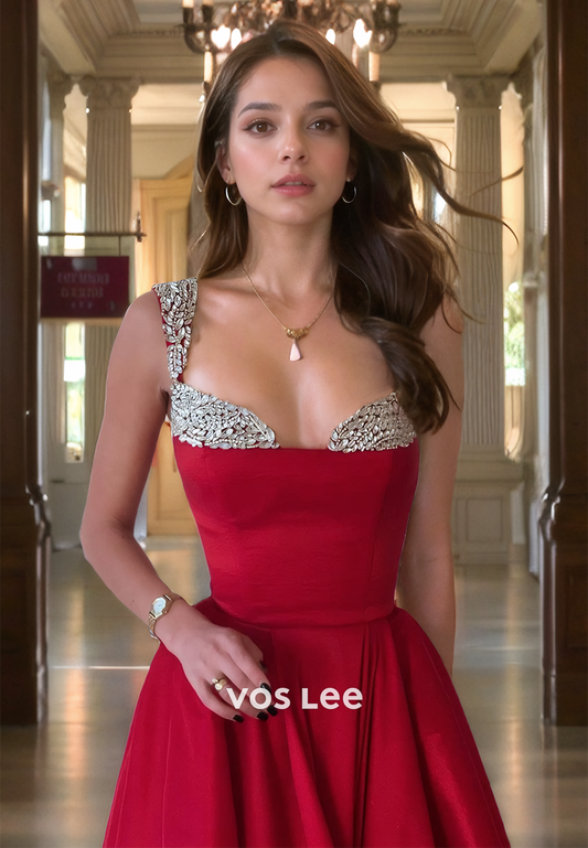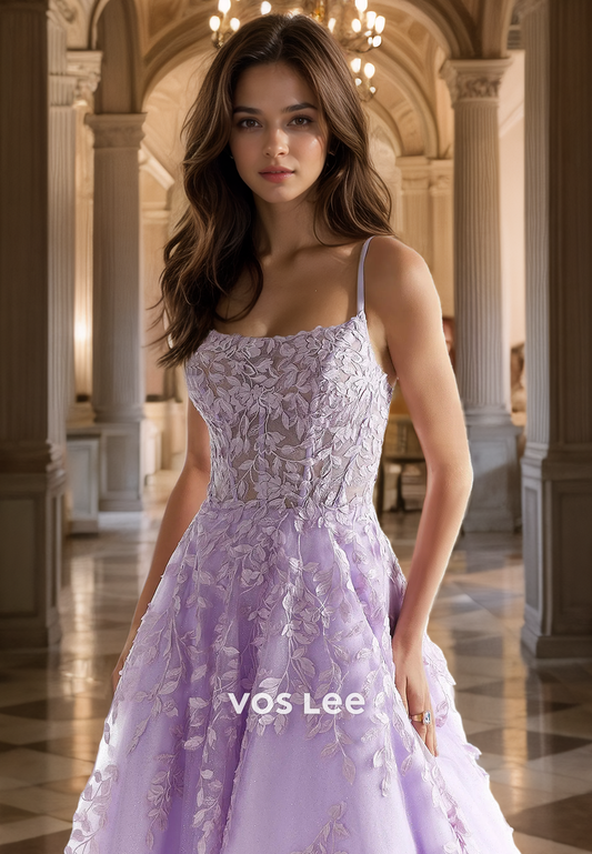 Elegant A-Line Spaghetti Straps Lace Appliques Tulle Prom Party Dress Glitter