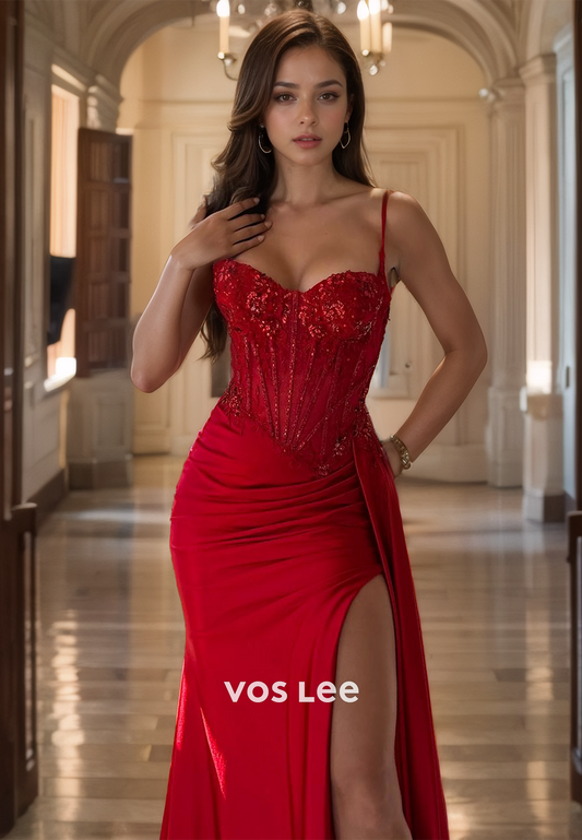 Sweetheart Spaghetti Straps Sequins High Split Prom Party Dress Glitter