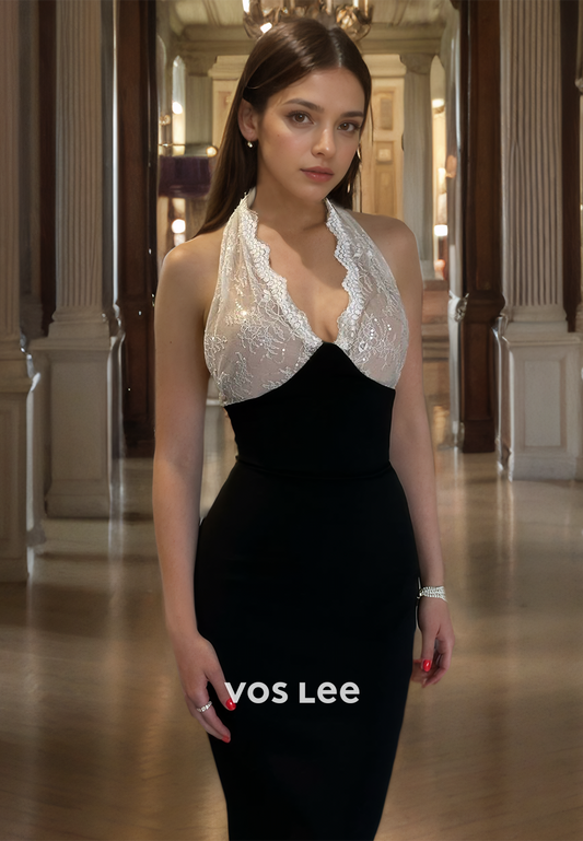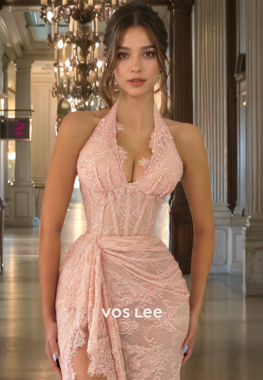 Elegant Halter Sheath High Split Lace Appliques Prom Formal Dress