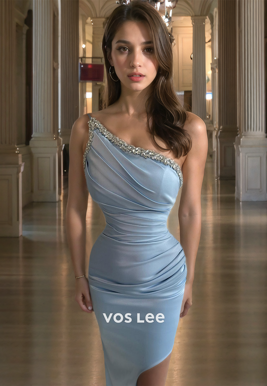 Elegant One Shoulder Column Crystal Beaded Prom Party Dress With Split