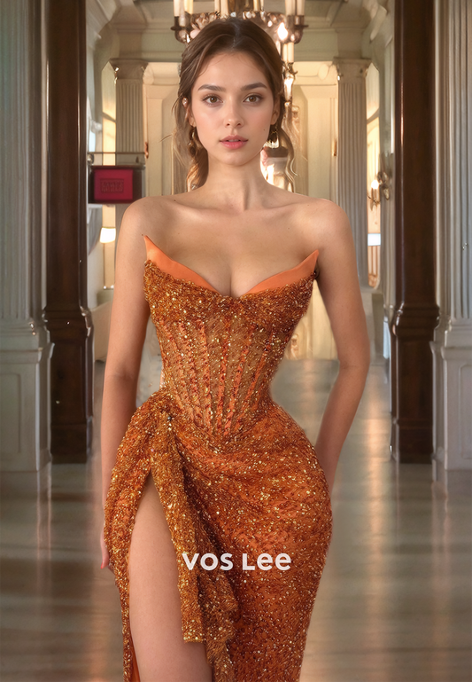 Luxurious Sequined Sweetheart Orange Formal Occasion Party Dress Strapless Floor Length Prom Dress with High Slit