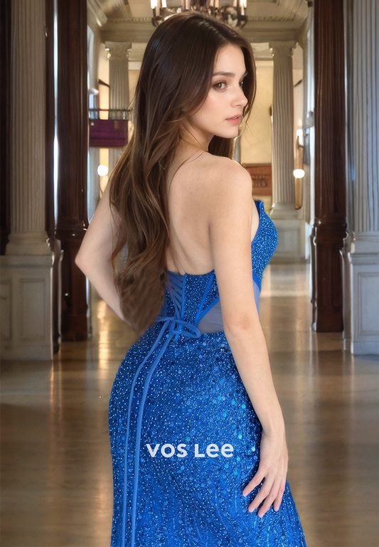 Sweetheart Royal Blue Strapless Prom Dress Velour High Split Formal Evening Party Gown