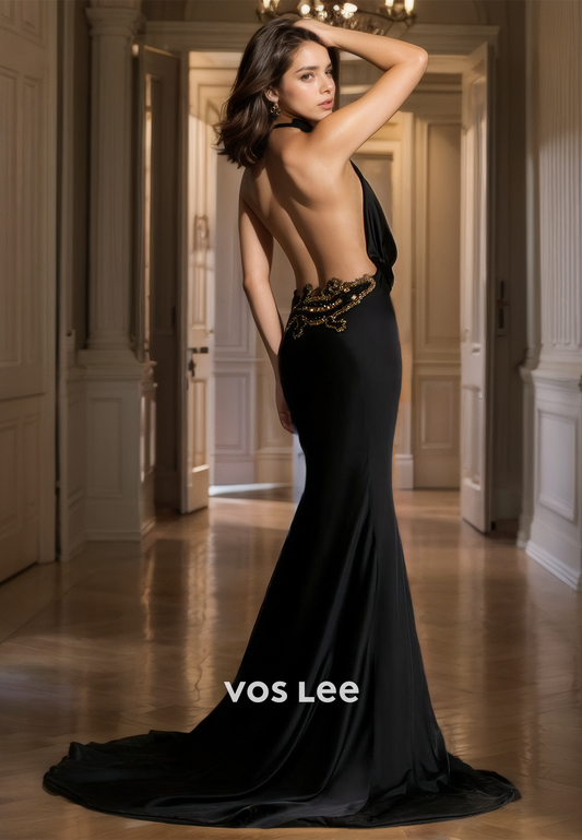 Sexy Black Deep V Neck Mermaid Prom Gown Halter Backless Appliqued Floor Length Evening Party Dress
