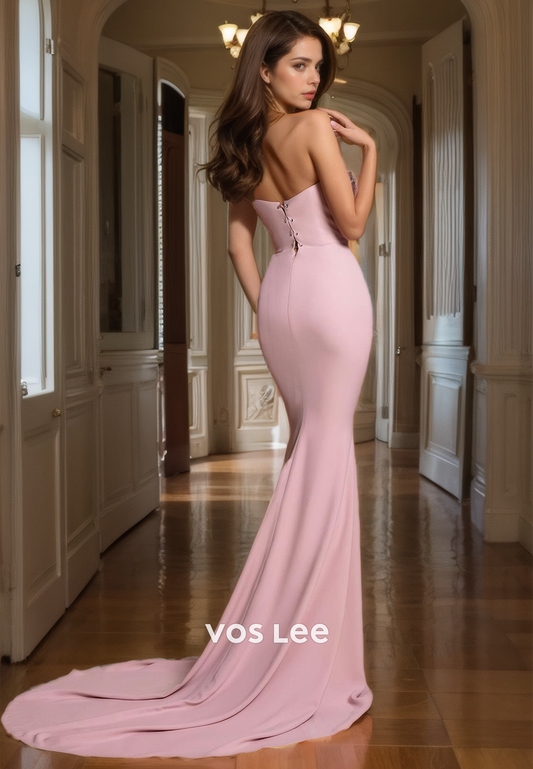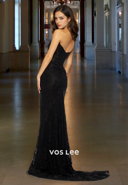 Sheath/Column Strapless Lace Prom Dress Zipper Back Floor Length Evening Party Dresses with High Split