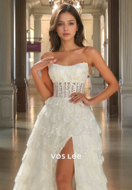 A-Line Strapless Scoop Tiered Lace Prom Dress White Side Slit Formal Pageant Gown