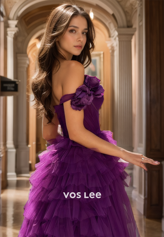 Graceful One Shoulder Purple Tulle Prom Dresses A-Line Tiered Luxury Quinceanera Dress