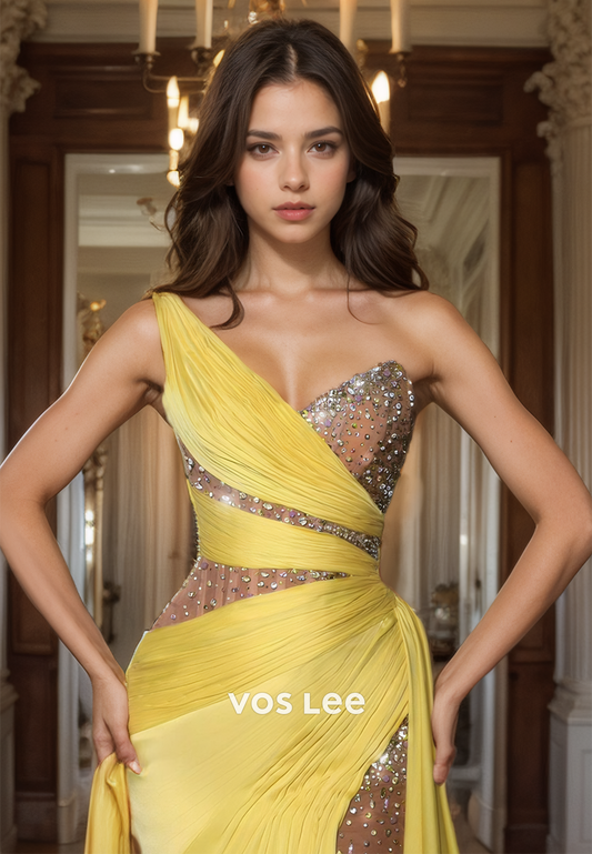 Luxurious Chiffon One Shoulder Yellow Quinceanera Dress Sparkly Sequined Pleated Prom Dress