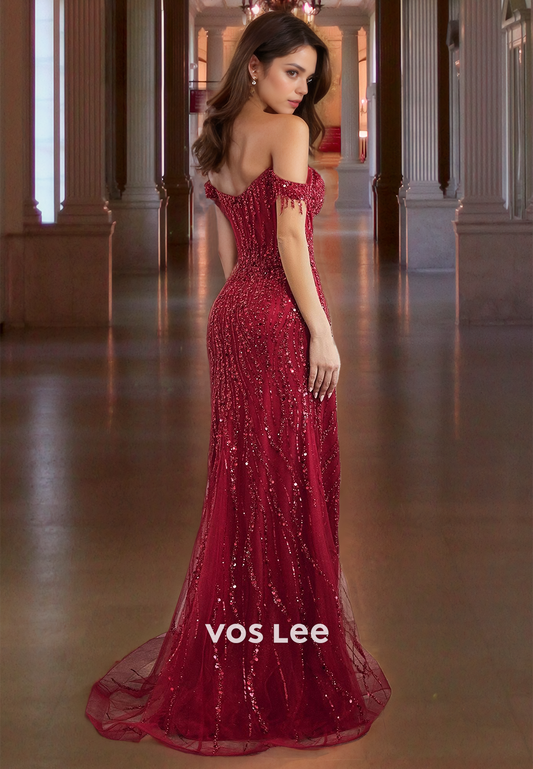Luxurious Sweetheart Mermaid Sequined Prom Dresses Off-Shoulder Zipper Back Formal Party Dress